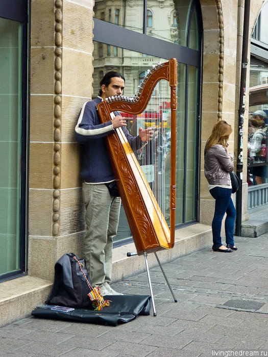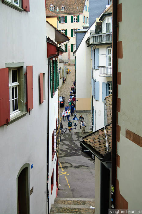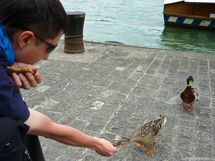 В Швейцарии всё оказалось дороже, поэтому кушать мороженое и прочие радости жизни задавила жаба. Доели заначки, привезённые из Германии, купили ореховый йогурт и воду, потом ещё бананы и шоколадку. Погулявшие чёрт знает как, поевшие так же, расслабились только сидя на берегу Рейна, наблюдая за хитрым паромом, похожим на гондолу, который не спеша курсирует от одного берега к другому, используя энергию течения реки. Всё та же жаба не дала нам покататься на этом странном паромчике. Но мы хорошо отдохнули и подружились с двумя утками.До этого, когда мы перекусывали в сквере, возле нас гуляли голуби, но стоило открыть хлеб, как у ног сразу столпились воробьи, материализовавшиеся прямо из воздуха. В общем, местные пернатые к нам прониклись.
