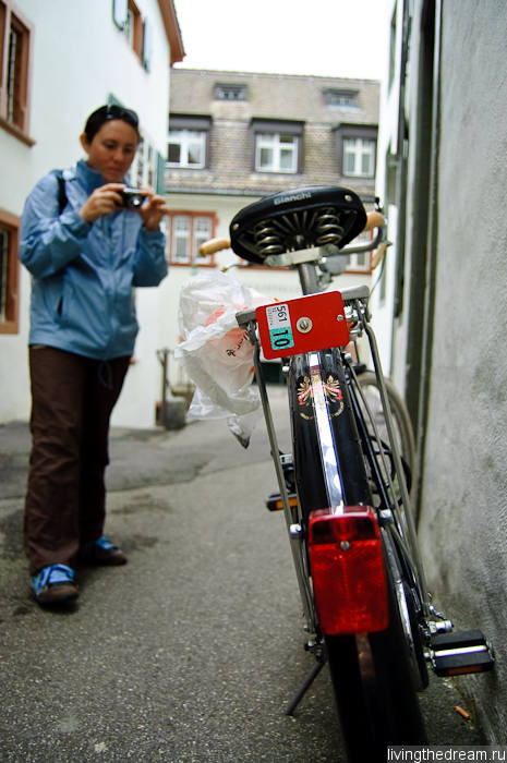 В Швейцарию мы попали стремительно потому что ехали с горки. Было это примерно так: пролетая мимо странных построек у дороги и над дорогой: “А! О! Э! Это же граница!”. Остановили тандем, сфотографировали пограничный пост, поздравили друг друга с приездом в Швейцарию, навигатор наконец-то уговорился нарисовать маршрут до дома наших хостов. Узнав, что осталось нам меньше 10 километров, радостные мы понеслись вдоль речки, то ли по лесу, то ли по парку, в сторону Базеля.