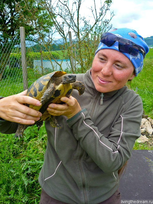 Обязательно мы узнаём что-то новое, всё время чему-то учимся. В этот раз от Паскаль мы узнали, что такое кинестетика, после путешествия надо узнать побольше, меня это заинтересовало. Ещё нас научили играть в какие-то карты про коров, я всем продула. Нам понравилось жить в этой семье ещё и потому, что они очень любят животных, как и мы. Мало того, что на ферме есть коровы, козы и пара осликов, в саду живут морские свинки и черепахи, я бы даже сказала целая черепашья колония. При нас привезли ещё черепашьих яиц, которые теперь закопаны в землю и ждут вылупления. Дома живут два кота и пёс Бен.