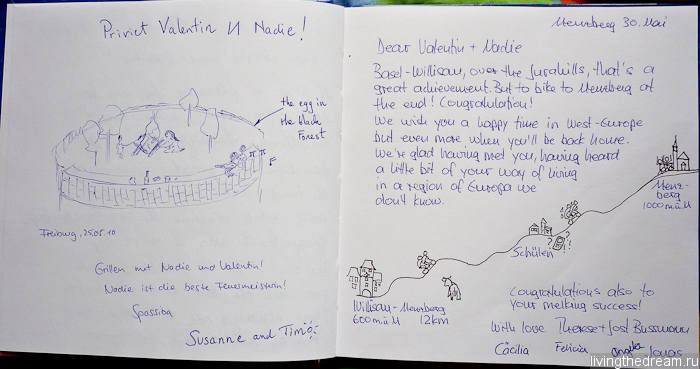 1. У нас есть книга путешествий. На правой странице — запись, которую нам оставили в Менцберге. Рисунок очень точно характеризует историю нашего восхождения.